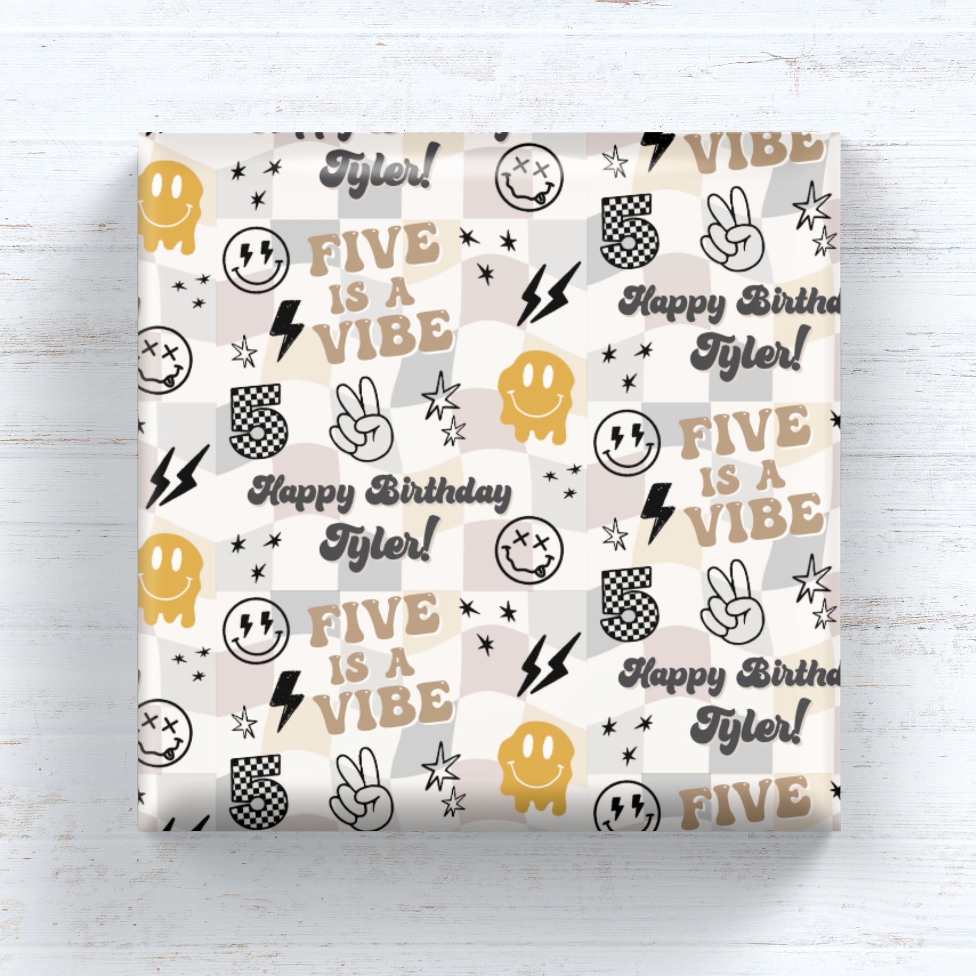 Celebrate his fifth birthday with our groovy "Five Is A Vibe" personalized gift wrap featuring retro smiley faces and checkers. This fun, retro-inspired design is perfect for the little one's milestone fifth birthday—because turning five is totally a vibe!