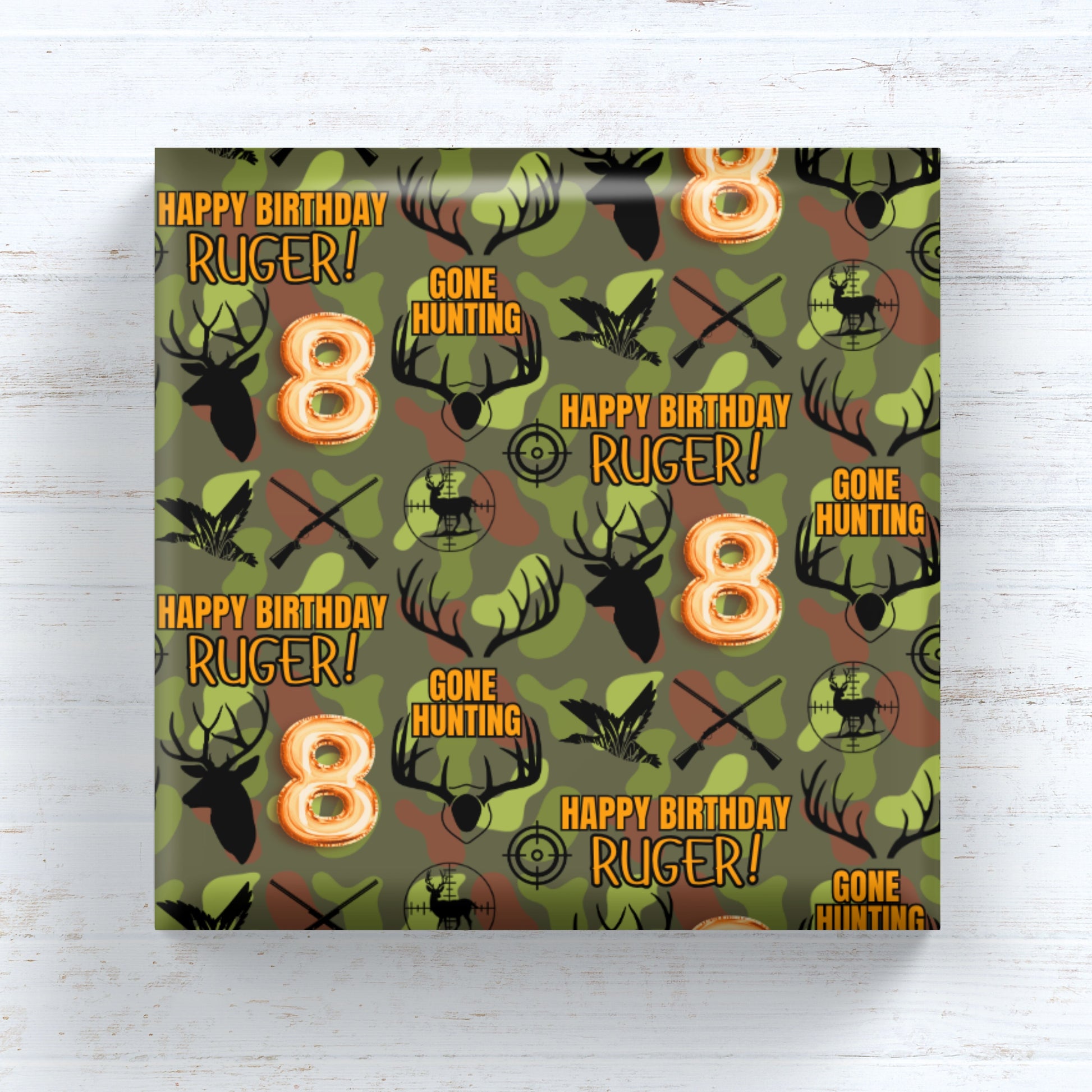 Celebrate their birthday with our rugged "Happy Hunting" personalized gift wrap featuring a hunting camo theme. This outdoorsy design is perfect for milestone birthdays—because it's time for happy hunting and celebrating another year!