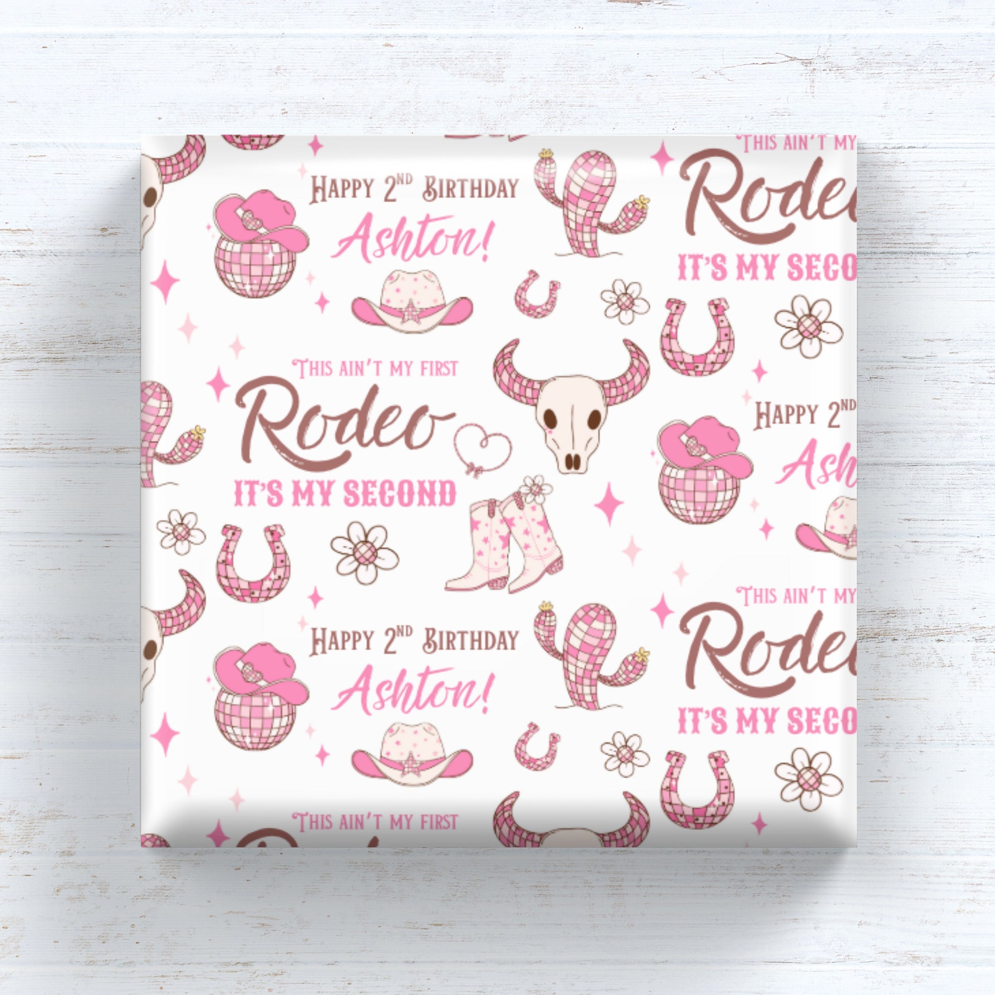 Ideal for wrapping toys, books, clothing, and all those special second birthday gifts. The playful mix of western elements with sparkly disco balls and pink cowgirl accessories makes it especially perfect for rodeo or cowgirl-themed parties or for little ones who love boots, hats, and a little bit of sparkle.