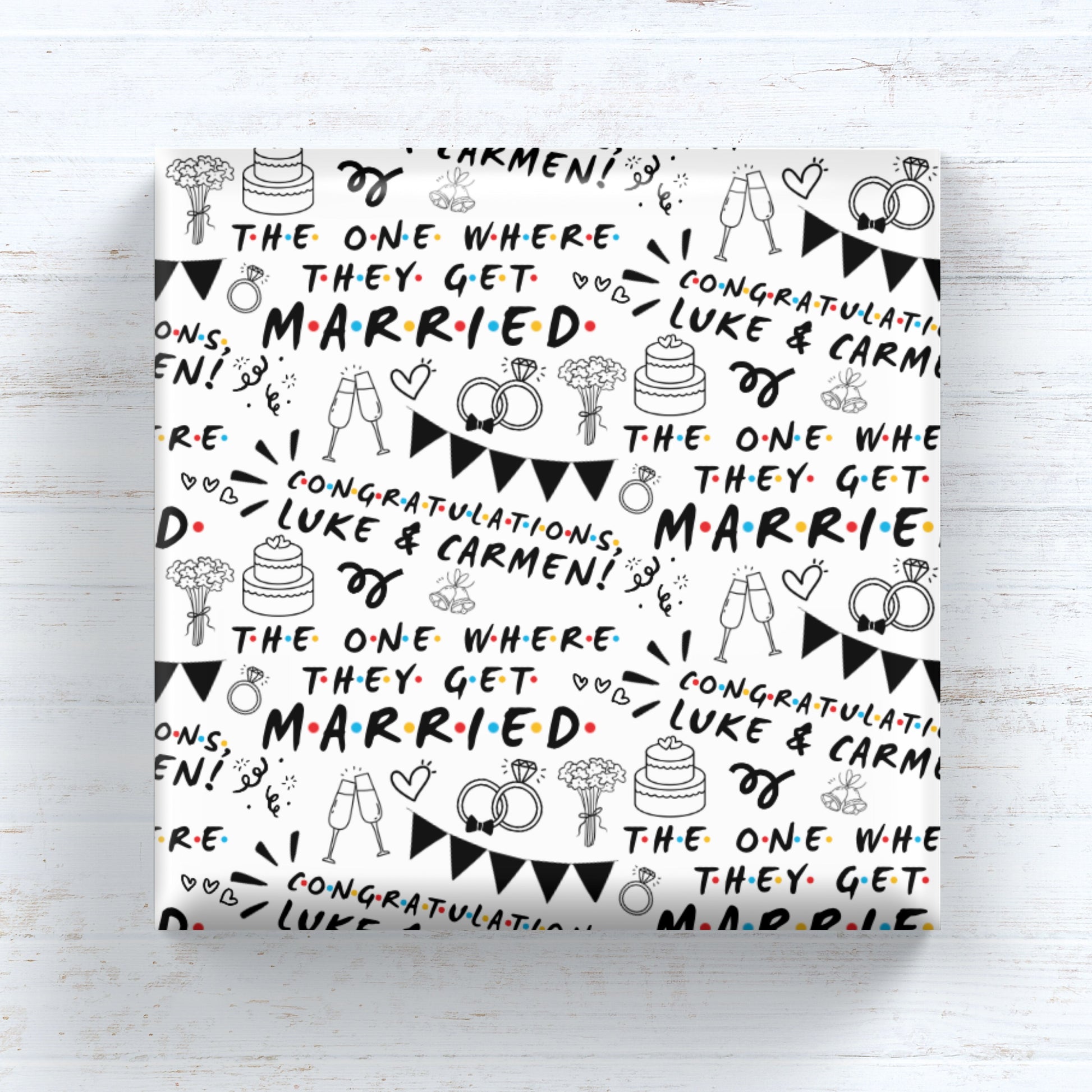 Celebrate their special day with our nostalgic "The One Where" personalized gift wrap themed after the iconic TV show Friends. This fun design is perfect for bridal showers and weddings—because this is the one where they get married!