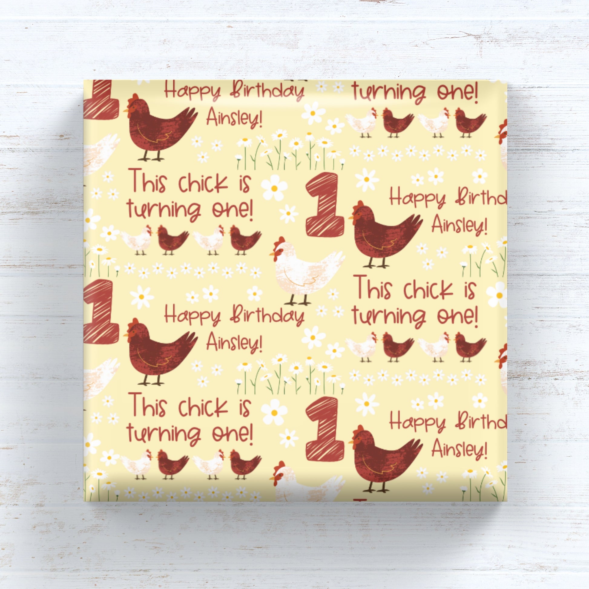 Celebrate their birthday with our charming "This Chick" personalized gift wrap featuring adorable red and white chickens and daisies on a buttery yellow background. This sweet farmhouse design is perfect for milestone birthdays—because this chick is worth celebrating!