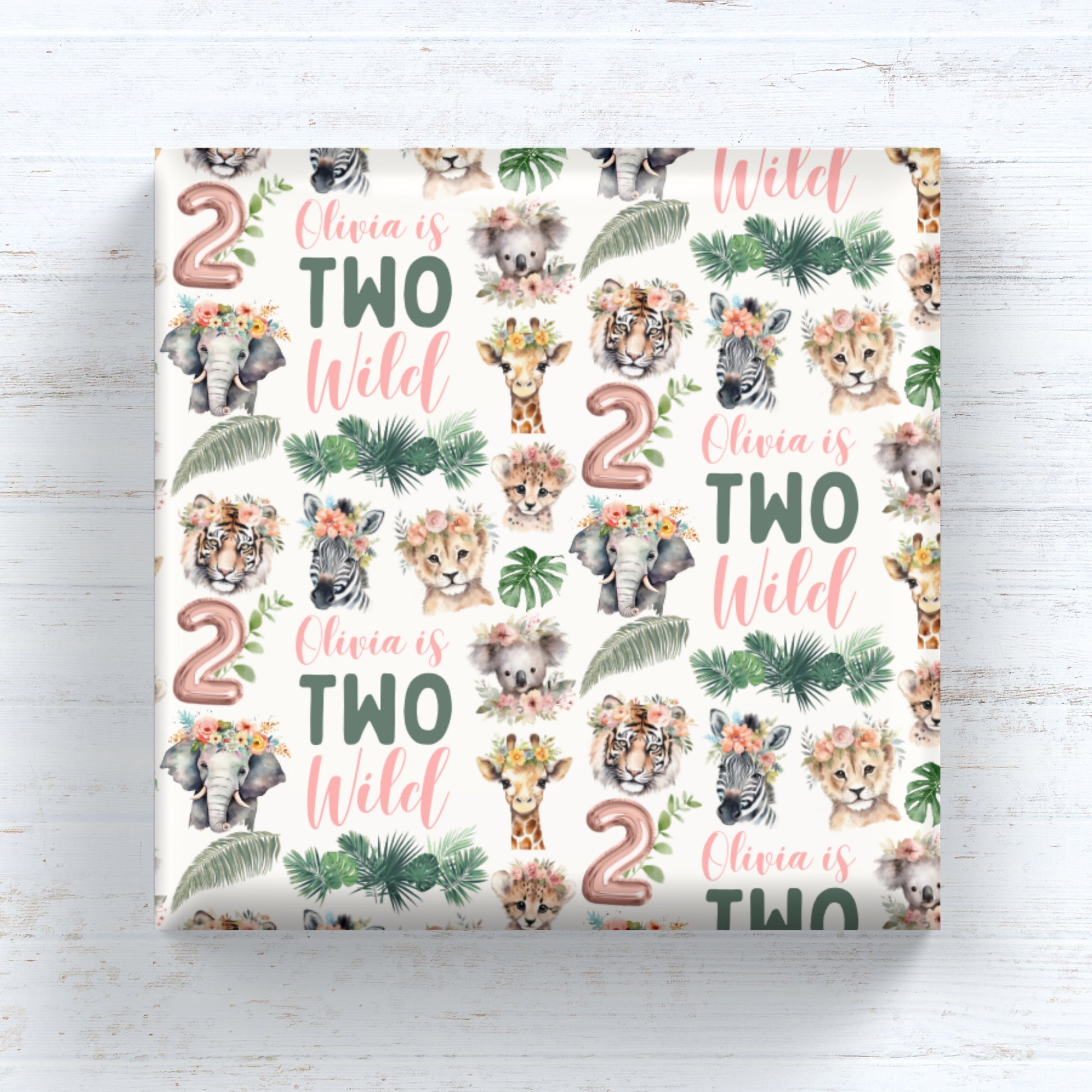 Celebrate her second birthday with our adorable "Two Wild" personalized gift wrap featuring jungle animals wearing cute flowers. This charming design is perfect for the little one's milestone second birthday—because she's two wild and ready to roar!